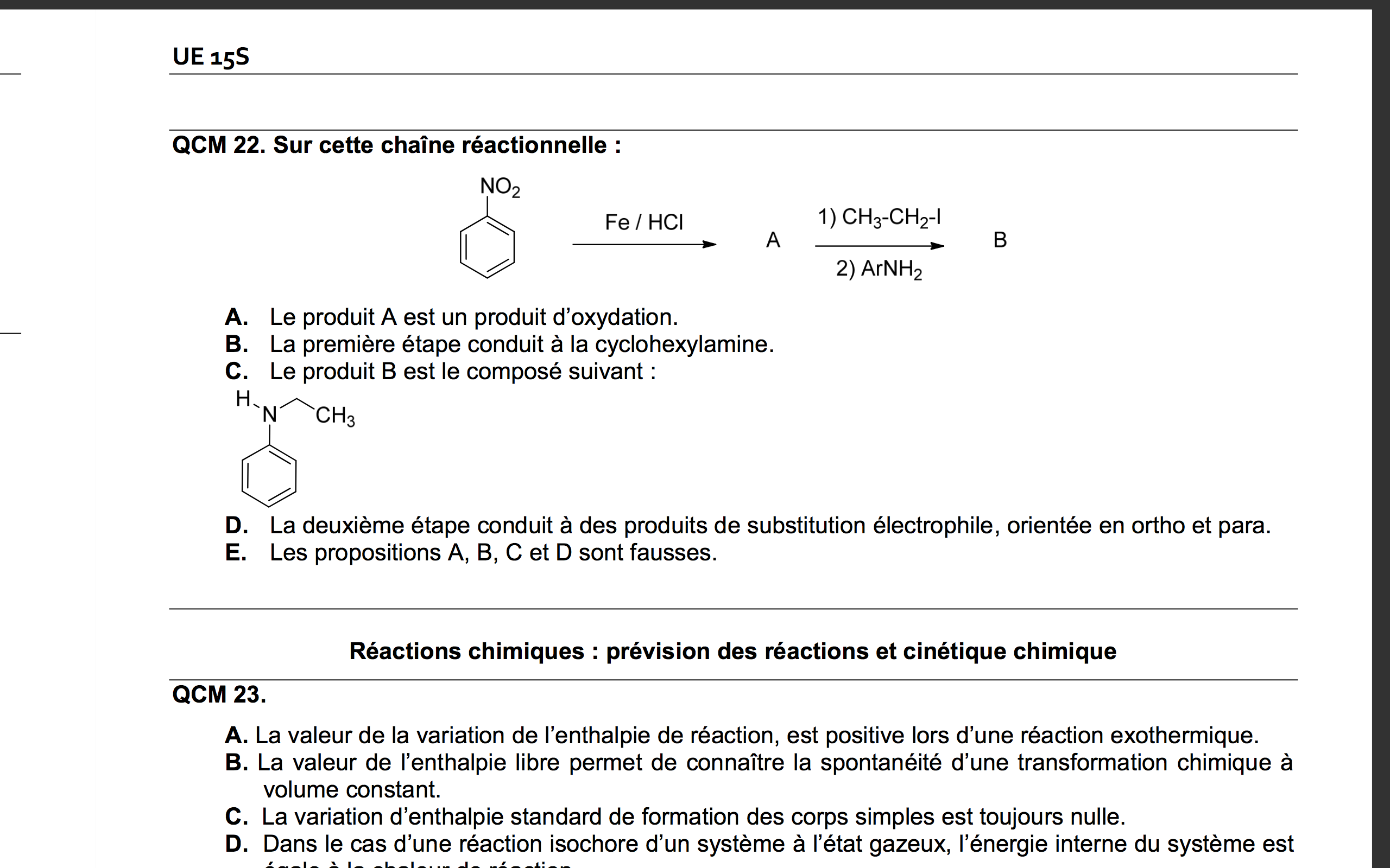 Alors, pour ce qui est de la réaction, on a le Fe/HCl (si tu as la fiche des réactifs qui est dispo sur le centre de téléchargement) on a donc un métal réducteur en présence de HCl qui est donneur d'hydrogène. On va donc avoir réduction du nitrobenzène en aniline (Cf. fiche des dérivés nitrés). Ensuite, tu vas devoir aller chercher dans la fiche sur les amines aromatiques et de voir la réaction au niveau des propriété de l'azote. On va faire réagir l'aniline avec un iodoéthane en présence d'aniline. On forme donc le N-éthylaniline. La réaction pourrait continuer mais pour cdla il faudrait un excès de iodoéthane. Cette réaction étant une SN...