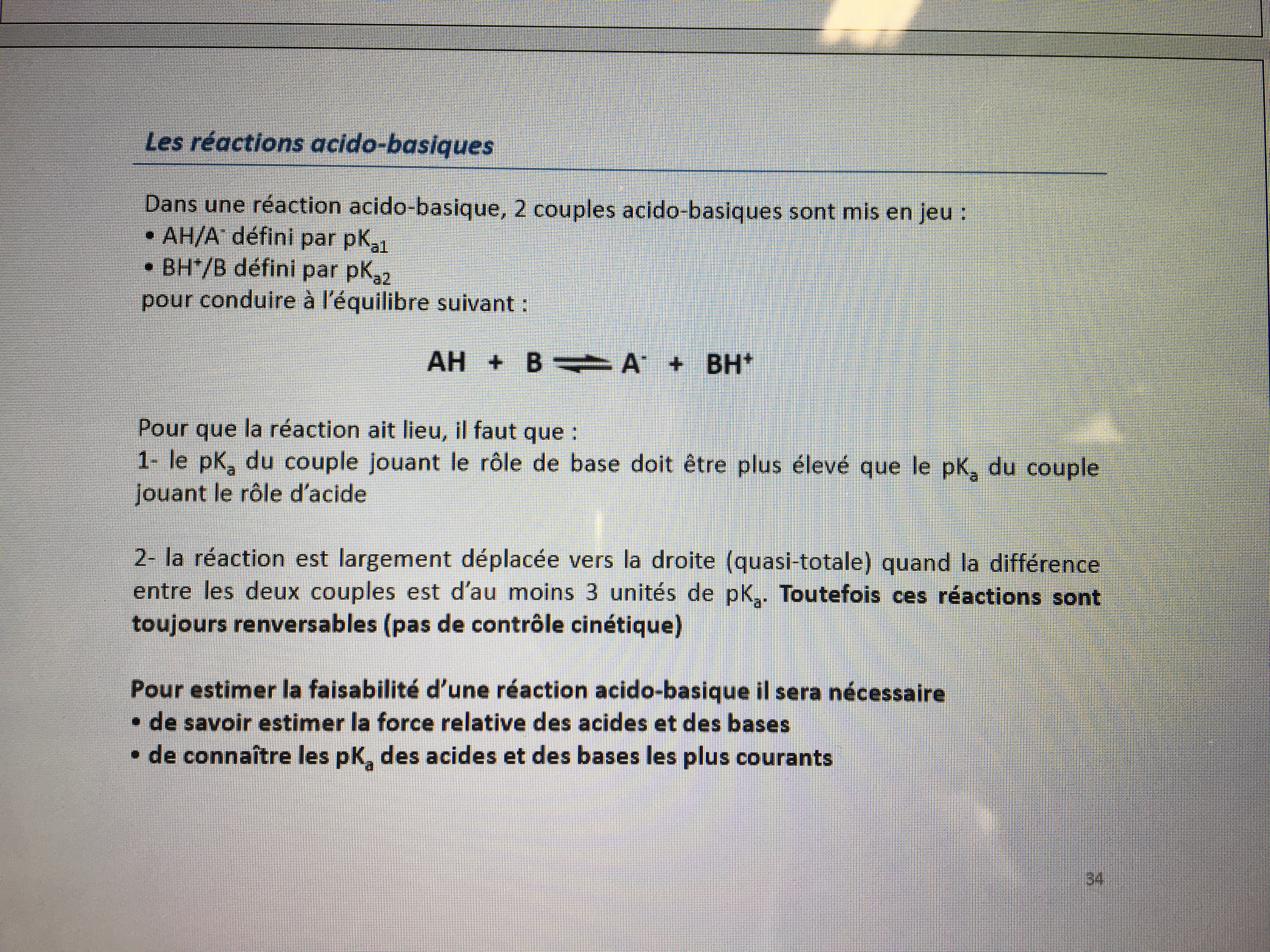 Mais par contre tu as quand même des réactions acido-basiques quasi totale = largement déplacée vers la droite. Et d’ap la def juste au-dessus ces réactions reviennent un peu vers la gauche parce qu’elles sont renversables