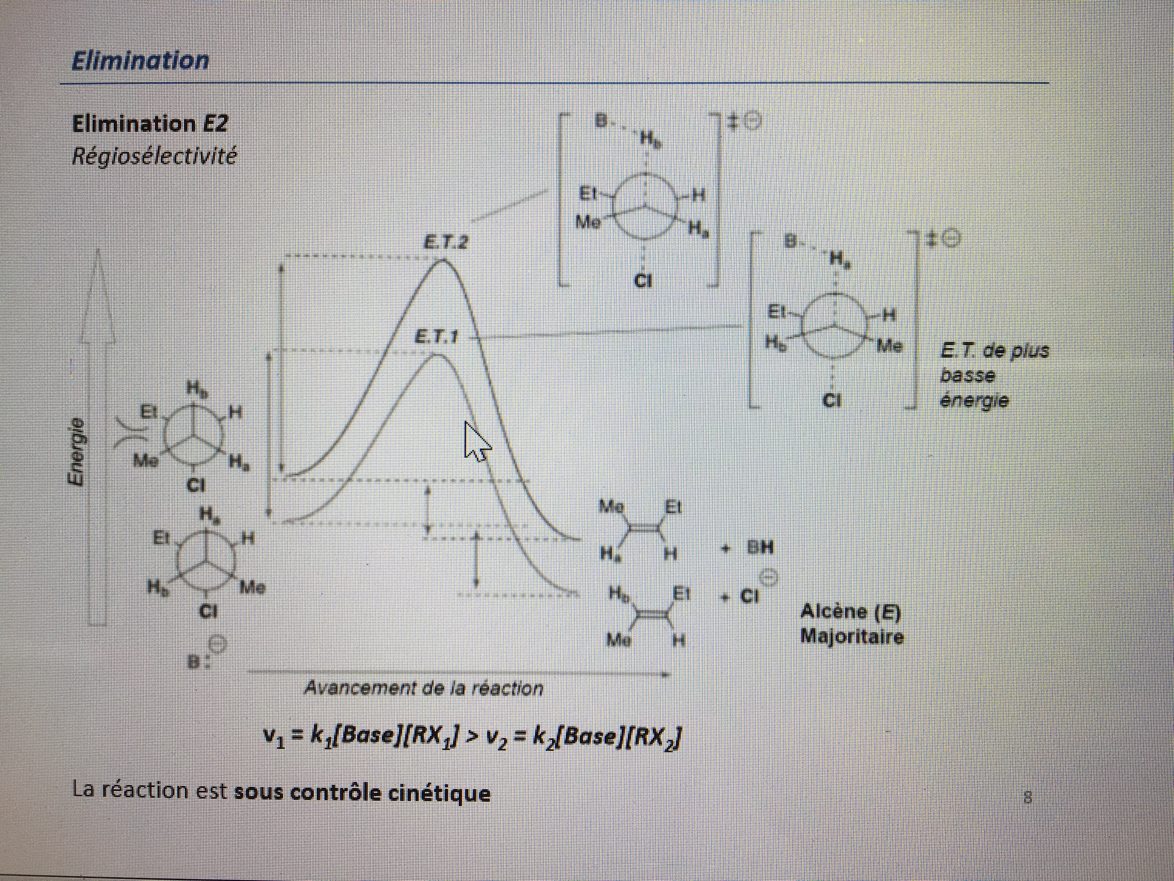 L’E2 est sous contrôle cinétique comme tu le vois sur la dernière phrase parce que on joue sur l’énergie d’activation ; plus l’ET (l’état de transition) est faible en énergie plus l’EA (énergie d’activation) est petite plus la réaction se fait vite.