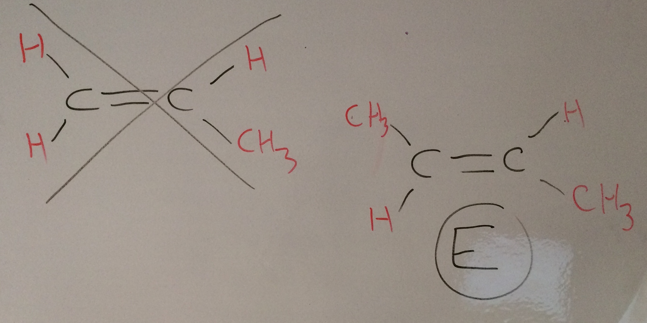 Les groupements portés par un même carbone de la double liaison doivent être différents, dans ce cas tout va bien car les groupements identiques sont réparties sur tes deux carbones, j'ai mis un exemple au cas où :