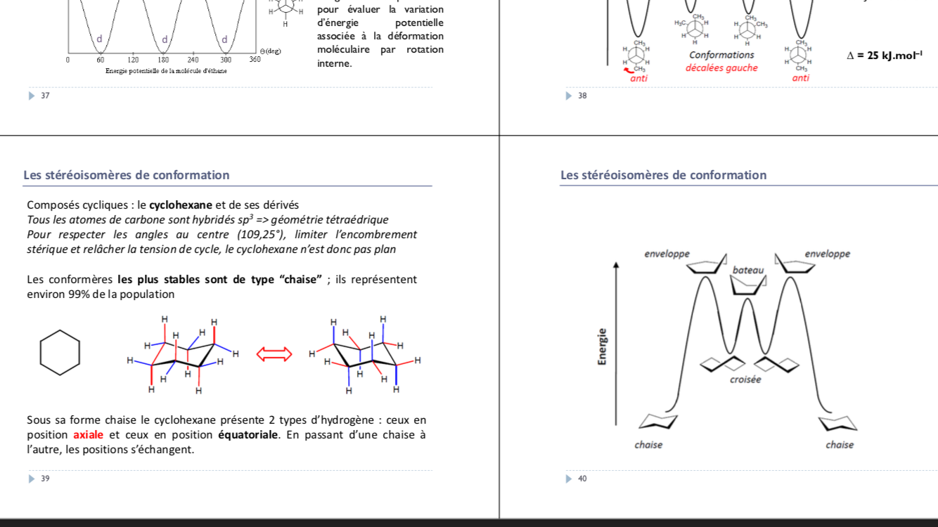 On voit bien diapo 39 que le type chaise est un type de conformère qui a ses hydrogènes en position axiale et équatoriale. Et diapo 40 (comme sur le 39) on voit bien qu’on peut passer d’une conformation chaise à une autre (en inversant toutes les positions)