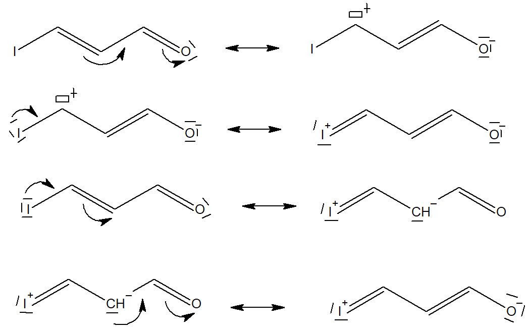 J'ai un souci sur l'effet mésomère, je ne comprends pas pourquoi dans la ronéo 3 p 3 avec la mésomérie de l'iode la liaison pi se déplace sur le carbone et non pas sur la liaison adjacente à l' O sachant qu'après, la liaison pi de l'oxygène peut se déplacer sur lui. Mais dans l'exemple on s'arrête sur le carbone, car il est marqué qu'il faut faut respecter la règle de l'octet mais je trouve que même en déplacent la liaison, le C sera toujours lié à 4 groupements. Je ne sais pas si j'étais clair 0_o.