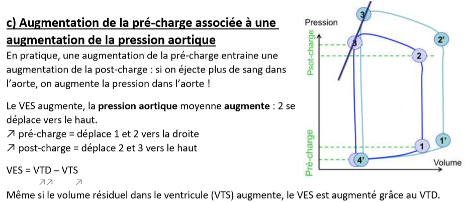 Une augmentation de la précharge associé à une augmentation de la pression aortique entraine une augmentation du volume résiduel, du volume d’éjection et du débit cardiaque ;