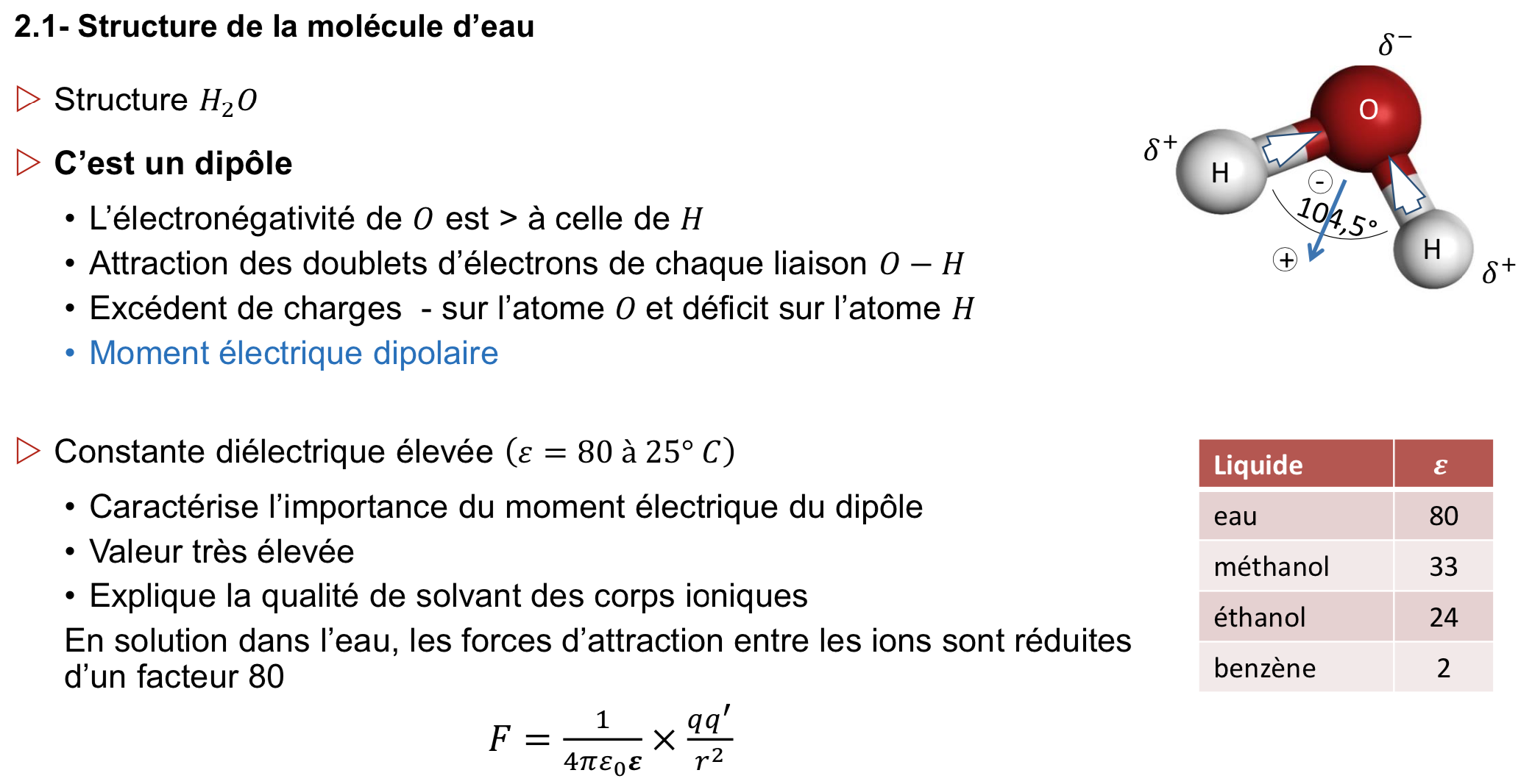 Donc caractère dipolaire --> Constante diélectrique élevée --> Fort pouvoir solvant