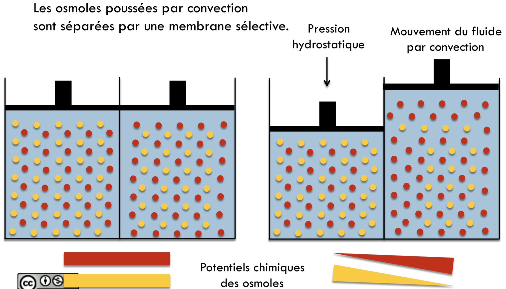Donc tu as 2 compartiments de même composition séparés par une membrane non sélective. Si tu appliques une pression hydrostatique sur C1, tu créés un mouvement de CONVECTION (cad d'eau et d'osmoles) vers C2 (donc ce n'est pas un potentiel chimique qui est à l'origine de la convection mais bien la pression hydrostatique ! ++ Le PC est à l'origine du phénomène de diffusion -> Attention à ça).
