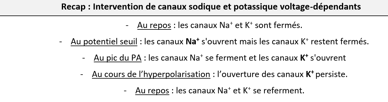 Vous dites que les canaux K+ sont fermés pendant le potentiel de repos, mais le potentiel de repos est expliqué par la perméabilité des canaux K+ supérieure à celle des canaux Na+, donc les canaux K+ sont bien ouverts pendant le repos