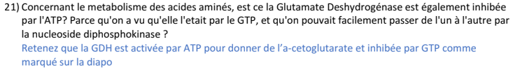 - -Dans le cours sur le catabolisme des AA, la glutamate déshydrogénase est régulée négativement par le GTP. Il y a aussi écrit que la réaction est inhibée par un niveau énergétique élevé; du coup est ce que l'ATP peut aussi inhiber la réaction ou c'est une régulation stricte? Edit nicolactate :arrow: La prof avait déjà répondu à cette question l'année dernière (c'est bien activée par ADP, c'est une petite errata de la prof qui avait mit ATP)