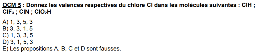 Slt, c'est à propos du qcm 5 du DM de la TTR, j'ai un blocage et arrive pas à comprendre cette histoire de valence des molécules :question: si vous pouvez me donner des explications ce serait super