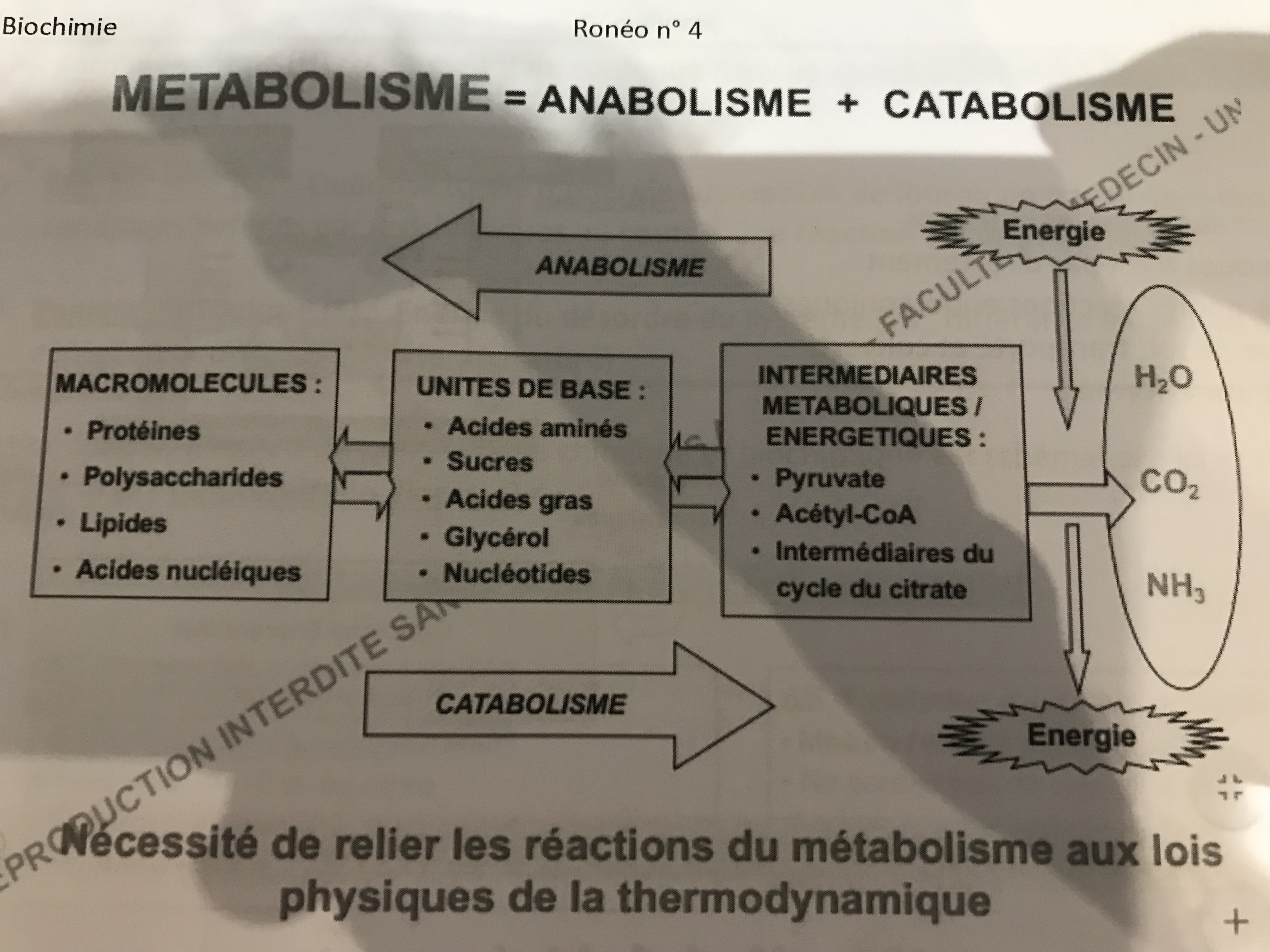 Alors c'est assez schématique donc faut pas trop en tenir compte mais tout simplement tu pars de macromolécules (Glycogène) qui vont être découpées pour former des unités de bases (Glucose) qui vont pouvoir s'engager dans des voies métabolique ( ex : La glycolyse avec le G6-P). Dans ces voies , on produit des molécules énergétique, plus précisément des liaisons hautement énergétique (LHE) au sein de ces molécules. Lorsque les liaisons seront rompus, cela va libérer beaucoup d'énergies ! ( Ex : Le passage du PEP au Pyruvate, on casse une LHE qui va libérer beaucoup d'énergies ).