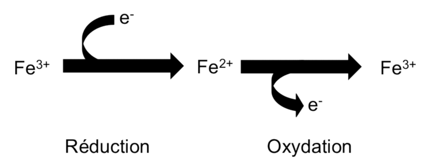 Alors en fait Fe2+ est la forme réduite du couple car il a subit une réduction (gain d'électrons) alors que la forme Fe3+ est la forme oxydée du couple car elle a subit une réaction d'oxydation (perte d'électrons)