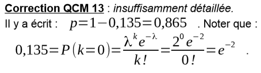 QCM 4 : Dans la correction la formule de la loi de Poisson est mal écrite, c’est e^(-lambda) et non e^(-k)