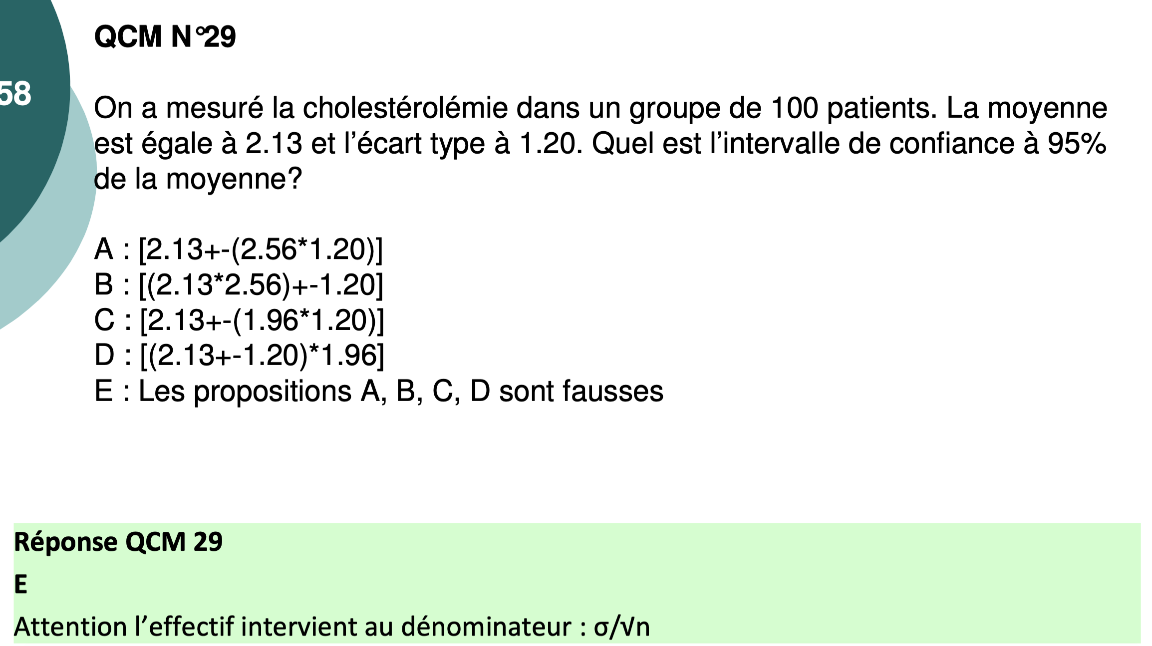 La bonne réponse aurait été (2,13 +- (1,96*1,20)/10), mais comme c'est pas proposé dans les items, la bonne réponse est la E.