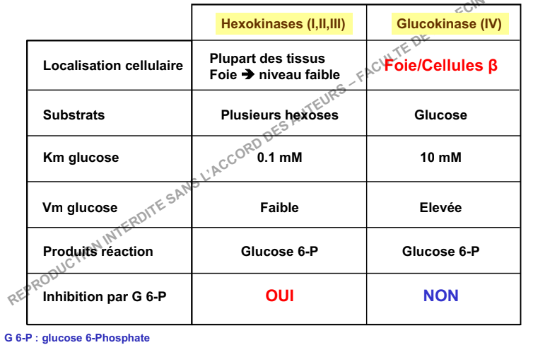 Tu vois bien qu'ici les Hexokinases I,II,III ont pour substrat plusieurs hexoses et sont situés dans la plupart des tissus alors que l’isoforme IV (Glucokinase) a une spécificité de substrat pour le glucose et tisulaire pour le Foie et les cellules Béta du pancréas !