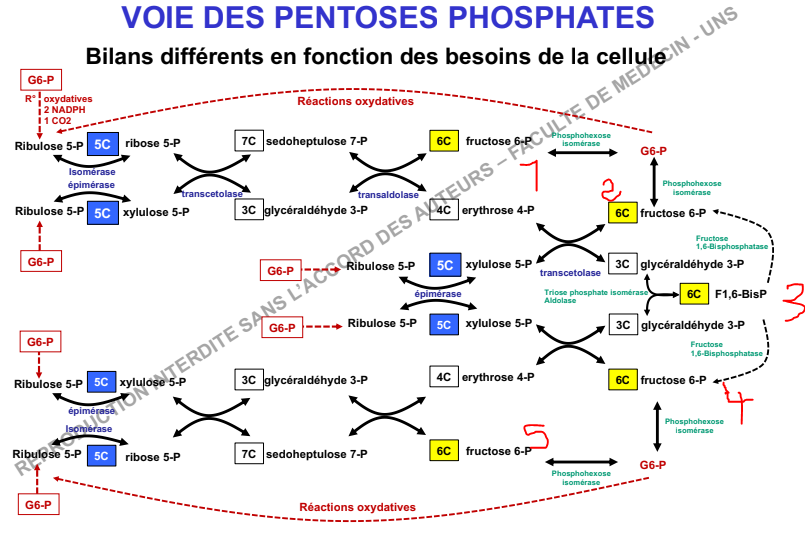 Je ne comprend pas le bilan du diapo 27 du professeur : 1 G6P (6 conso- 5 rendu)+ 12 NADP+ + 6 H2O---> 6 Co2 + 12 NADPH H+