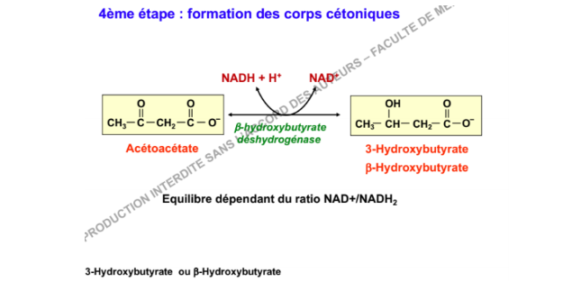 Donc si le ratio faible donne du 3 hydroxybutyrate (le produit), cela veut dire qu'il y a moins de NAD que de NADH (vu qu'on en a besoin pour forme le produit) donc le ratio se présentera sous cette forme NAD/NADH.