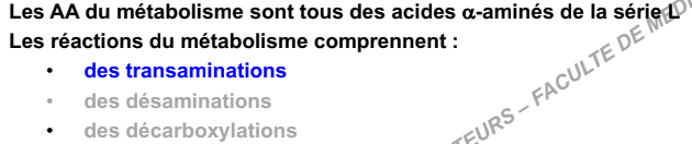Salut, je ne comprend pas pourquoi on dit que l'élimination du groupement aminé se fait par trans/désamination car on dit après page 18 qu'on ne relâche pas le NH3 donc qu'on aura une désamination après.. Donc il serai plus juste de parler seulement de transamination lorsqu'un AA transfère sont NH3 sur un alpha-CA ?