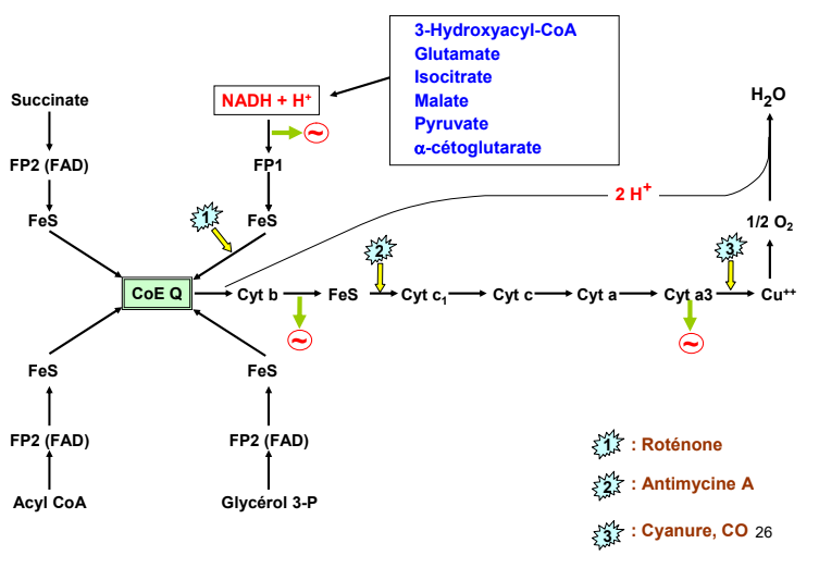Dernier petit point par rapport aux inhibiteur, on nous donne l'exemple de Roténone et on nous dit que tous les transporteur en amont du point de blocage sont à l'état réduit (Fe2+/ COeQCH2). Or la roténone bloque le transfert d'électron entre Fe-S et CoeQ donc je ne comprend pas pourquoi CoeQ est réduit car il se situe en aval de l'action de la roténone.