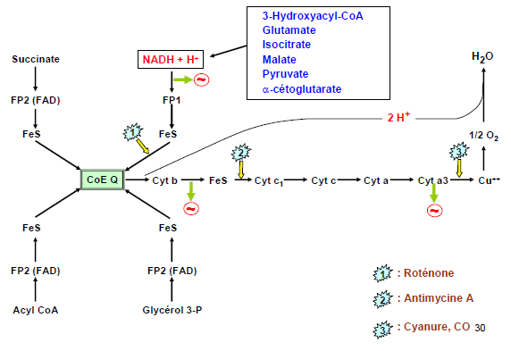 ici il faut retenir que tout ce qui est en amont du bloquage sera sous forme réduite ! En gros c'est comme si vous bloquez une route, vous allez avoir un embouteillage en amont. Ici l'antimycine A bloque au niveau du complexe 3 ! Donc tout ce qui est au niveau du complexe 1 et 2 seront sous forme réduite car on pourra pas oxydé nos molécules ! Tout est bloqués !