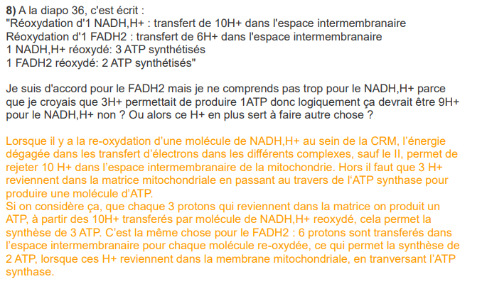 En relisant le cours et la diapo sur la CRM il y a quelque chose que j'arrive pas à expliquer, lors du transfert d'électrons via l'oxydation du NADH2 dans le complexe I il est spécifié dans le cours qu'on a le transport de 4 H+ depuis la matrice (ca se voit aussi sur son schéma sur la diapo sans être écrit explicitement) mais à la fin on dit que la réoxydation d'un NADH2 permet de transfert de 10 H+ dans l'EIM...J'me demandais si on parlait bien de la même chose ou si j'ai loupé des étapes ou pas pris des choses en compte.. Après le transfert des 4 H+ est pas explicité mais on le voit tout de même sur son schéma (en plus d'être dans la ronéo alors je sais pas si elle l'a dit à l'oral) ! Un petit éclaircissement serait pas de refus.