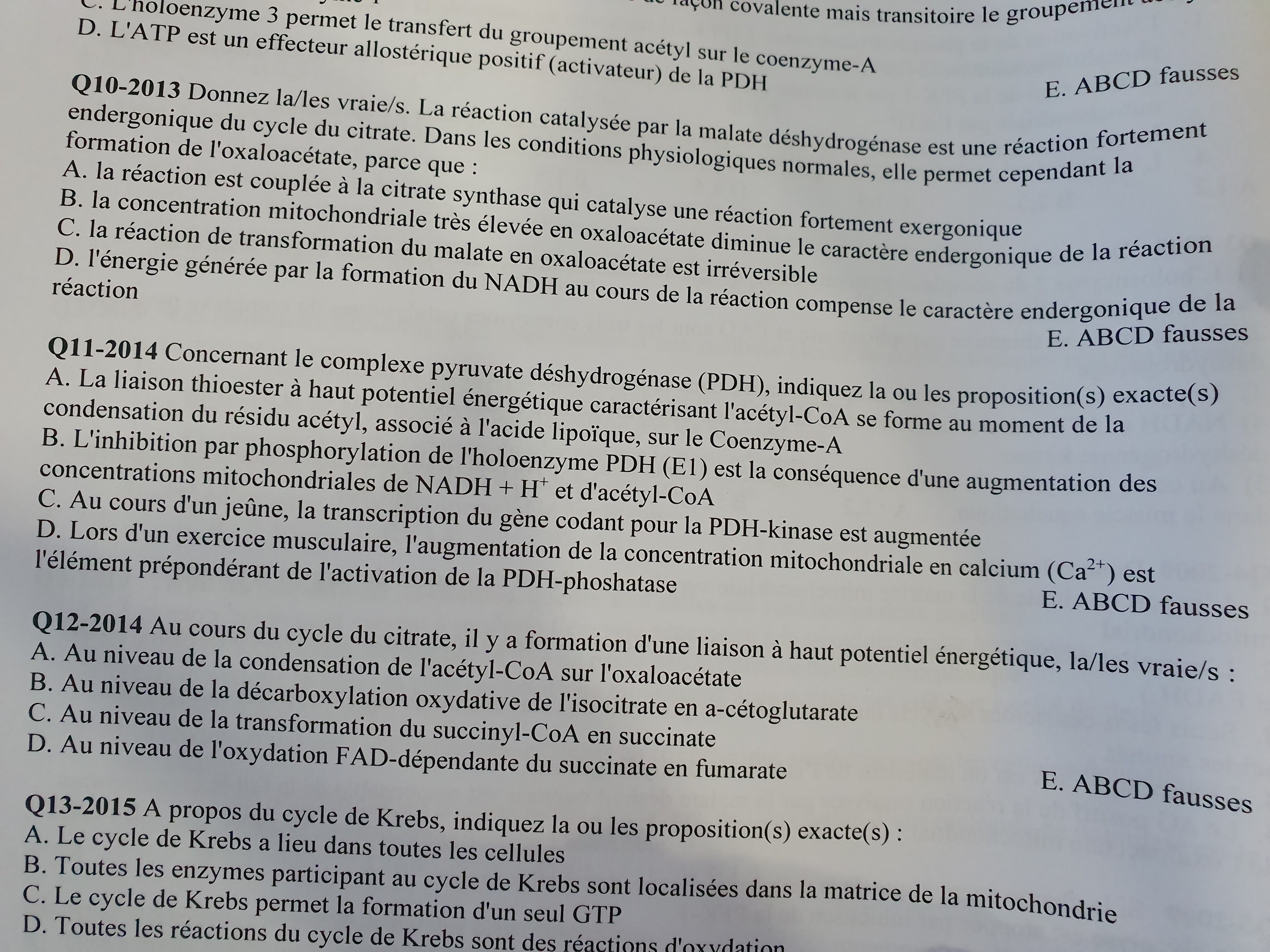 je voulais savoir ce que vous pensez de l'item B du qcm 11 compté vrai, pour moi le NADH et l'AcCoA inhibe de façon allosterique respectivement E3 et E2, mais n'entraîne pas l'activation de la PDHkinase non ? Peut-être que j'ai mal compris, dites moi svp si une augmentation de NADH ou AcCoA entraîne l'activation de la PDH kinase qui par la suite va phosphoryler E1, je bug un peu sur cette notion, merci !!!