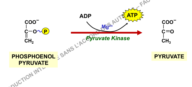 Egalement un autre exemple: la dernière réaction de la glycolyse --> passage du PEP au pyruvate par la Pyruvate Kinase. On casse une liaison Hautement énergétique (LHE) au niveau du PEP qui libère un phosphate qui ira se lier à un ADP afin de former un ATP et cette réaction est exergonique ^^