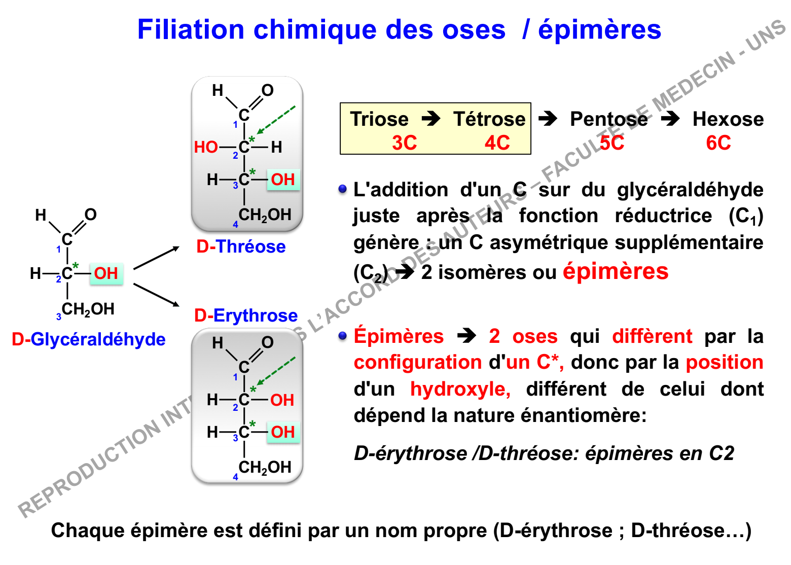 " L'addition d'un C sur du glycéraldéhyde juste après la fonction réductrice (C1) génère : un C asymétrique supplémentaire (C2) et 2 ISOMÈRES ou épimères. "