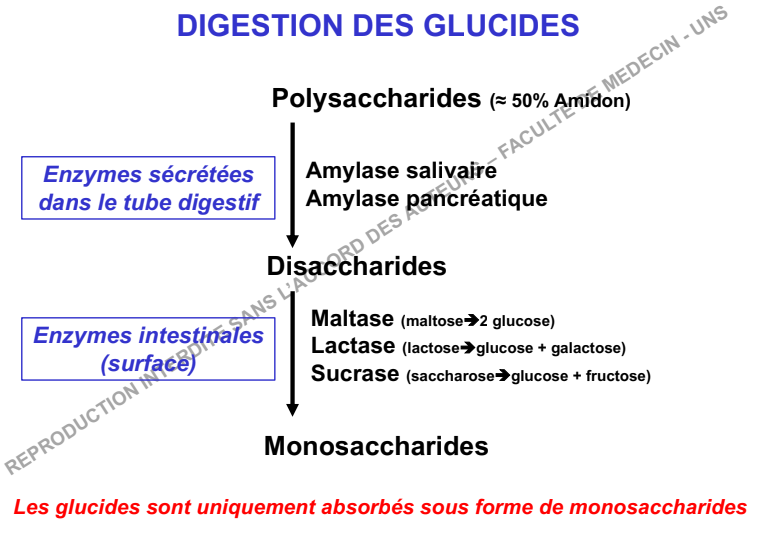 Alors ici c'est une notion ULTRAAAAAA importante à comprendre !!! Pour absorber nos sucres, protéines et lipides que nous mangeons, nous devons les dégradés car ils ne seront absorbés que sous forme de MONO-entité !! (mono-saccharide/AG/AA). Ici grâce à l'action des amylases où découpent nos "gros sucres" pour produire des disaccharides qui seront encore coupé et deviendront des mono-saccharides ! Juste ici la diapo