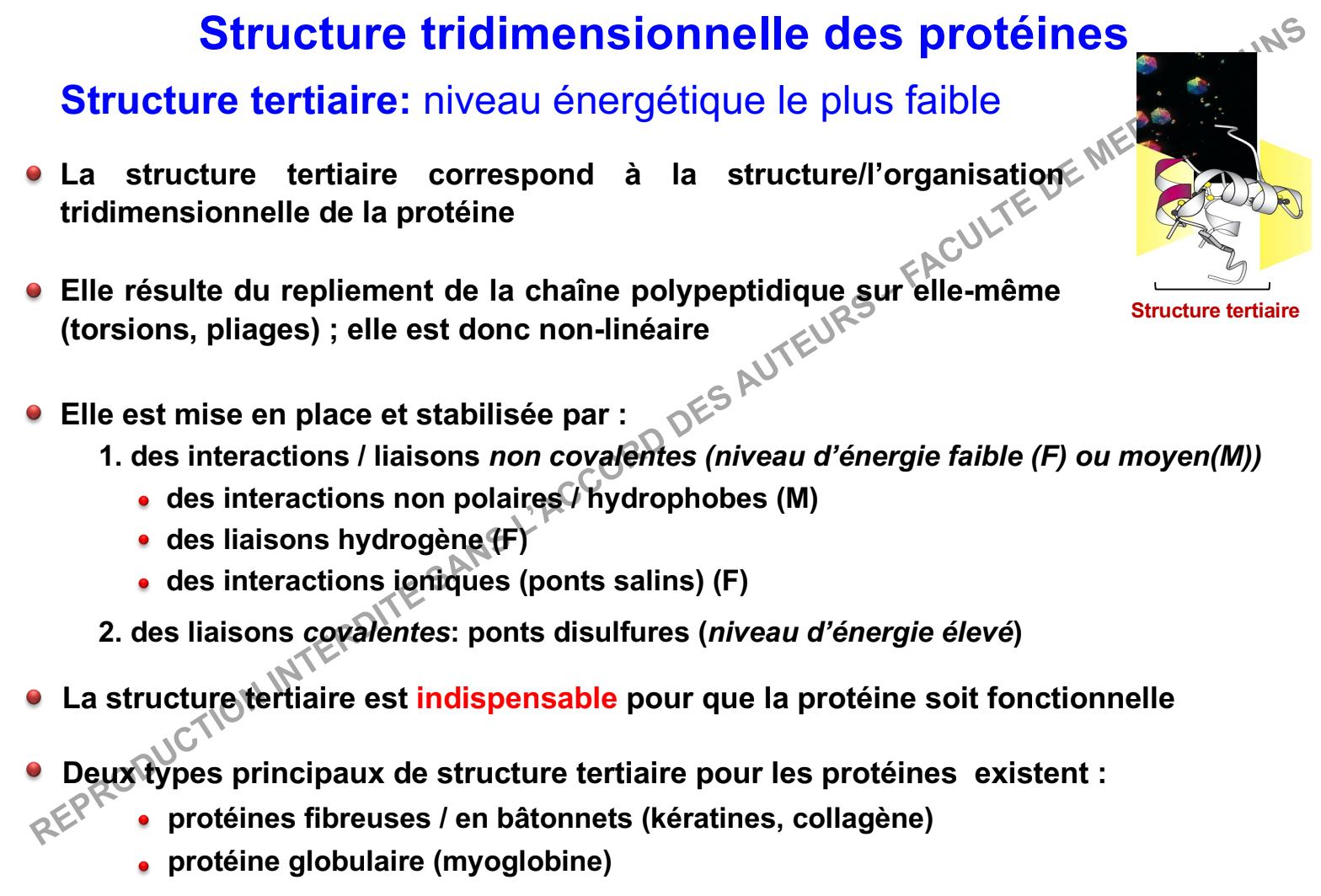 salut, concernant l'item D que les 2 types principaux de structure tertiaire pour les proteines sont : les protéines fibreuses ( kératine et collagene ) et prot globulaires mais sur le diapo du prof le collagene n'est pas cité dans la partie des protéines fibreuses
