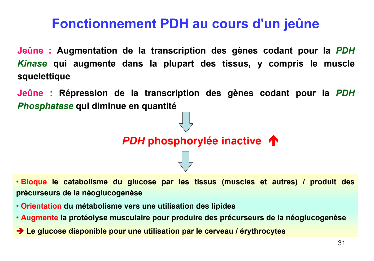 Je l'ai compté faux parce que y avait "muscle strié". Sauf que je crois qu'en période de jeune le muscle ne participera à rien de tout ce qui est NGG tout ça...Et si on bloque la PDH c'est essentiellement parce qu'en période de jeune on manque de Glucose et on veut en faire plus avec la NGG donc transformer plutôt le pyruvate en OAA non ?