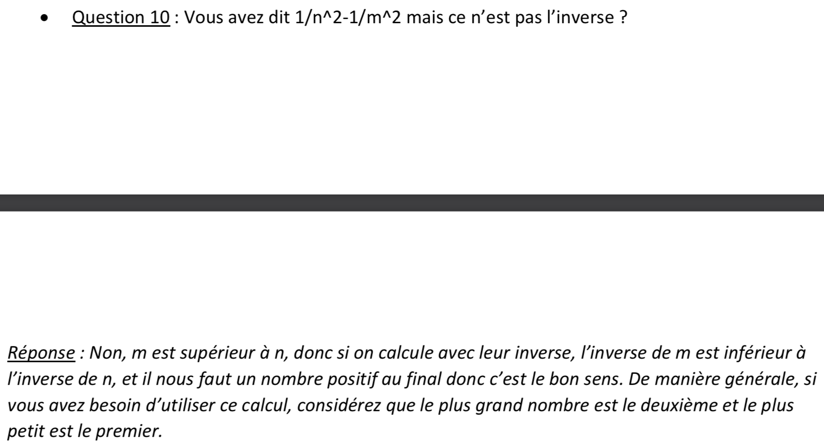 Durant son cours, le prof a donné un exemple avec m > n. Et tu remarqueras que les deux fractions sont inversées d'une réponse à l'autre