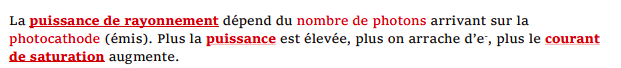 6) On dit que plus la puissance est élevée, plus on arrache d'e- plus le courant de saturation augmente car qui dit puissance élevée dit beaucoup de photons, dit bcp d'arrachage d'e- dit un courant max possible plus élevé ?