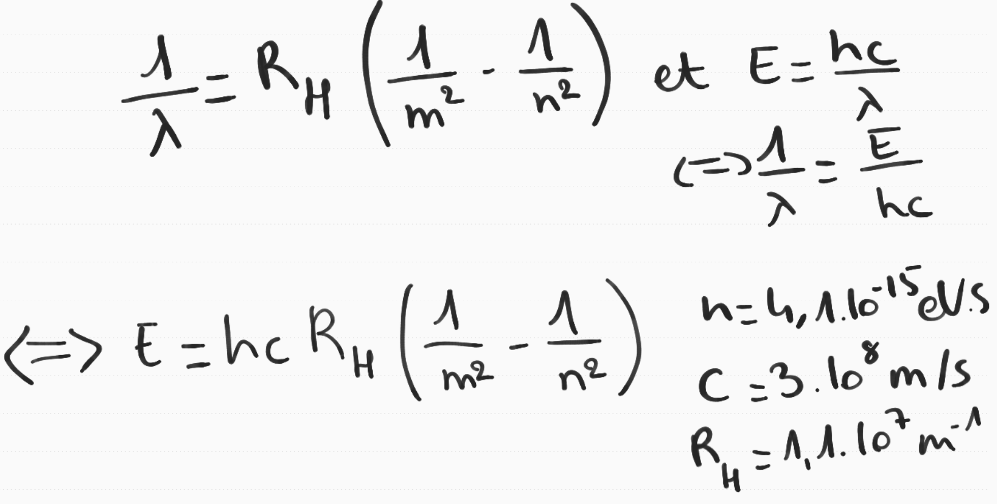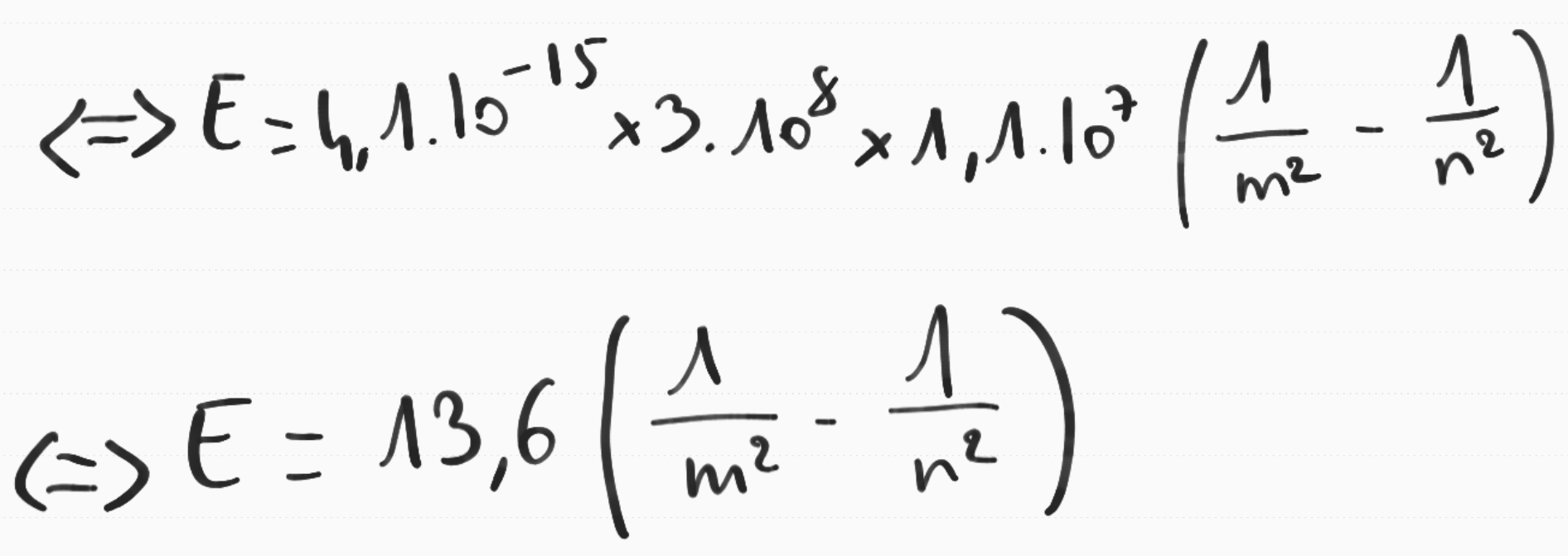 je n'arrive pas a comprendre cet item. Je vois qu'il fait référence a la formule avec la différence de l'inverse de carrés d'entiers, ainsi qu'a celle qui nous donne l'énergie mécanique des e- selon leur couche n, mais je ne comprends pas pourquoi on mélange les 2... pour moi au lieu de 13,6 il faudrait mettre la constante de Rydberg