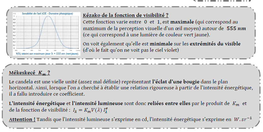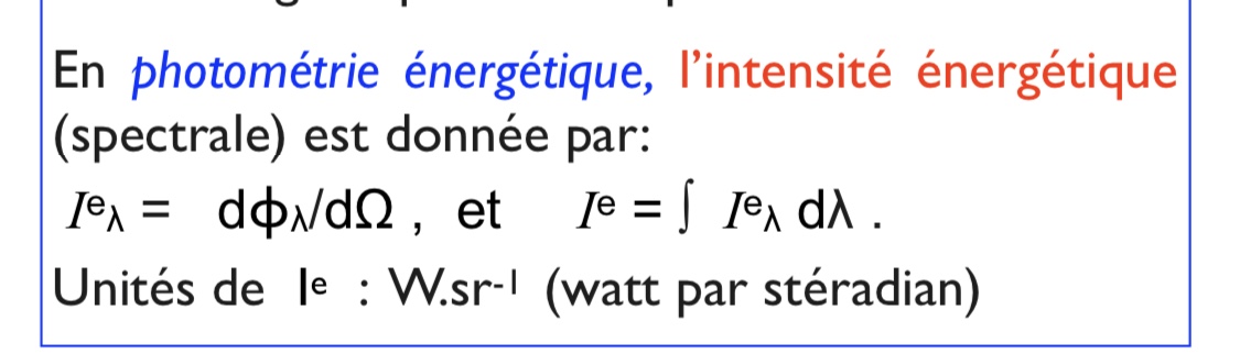 C'est d'ailleurs pour ça que tu as la "même formule" pour l'intenisté énergétique et l'intensité lumineuse, avec seulement la présence de ce facteur de proportionnalité en plus pour l’intensité lumineuse :