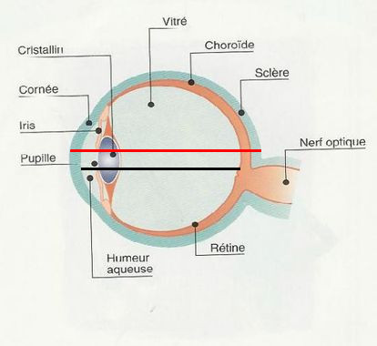 Ici le trait rouge te représente le diamètre de l'oeil tandis que le trait noir représente la distance cornée macula.