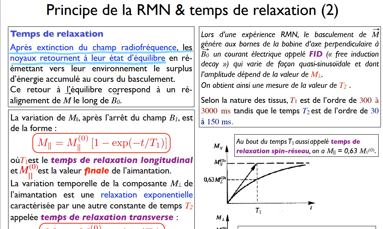 j'aurais une question sur l'item c "le temps de relaxation correspond au temps moyen, après l'arrêt du champ radiofréquence, de retour à l'équilibre des noyaux". Je l'avais compté faux car que ce soit le temps de relaxation longitudinal ou transversal, il ne correspondent pas au temps moyen mais aux temps où on a respectivement 63% et 37% . Du coup je voulais juste savoir si le temps de relaxation était une info en plus qui correspondrait à la définition donnée dans l'item, parce que je n'arrive à la trouver ni dans la ronéo ni dans le diapo du prof,