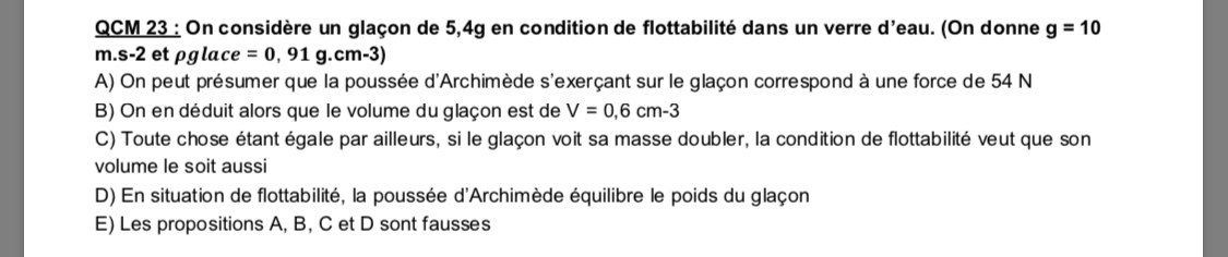 Après, réfère-toi à l'esprit du QCM, si on te fait utiliser le volume immergé sans moyen de le calculer, alors je pense que tu PEUX considérer l'objet comme complètement immergé, après, vraiment, ça dépend de l'esprit du QCM et je ne peux malheureusement pas te dire comment le prof va tourner ses questions au concours de cette année :confused: