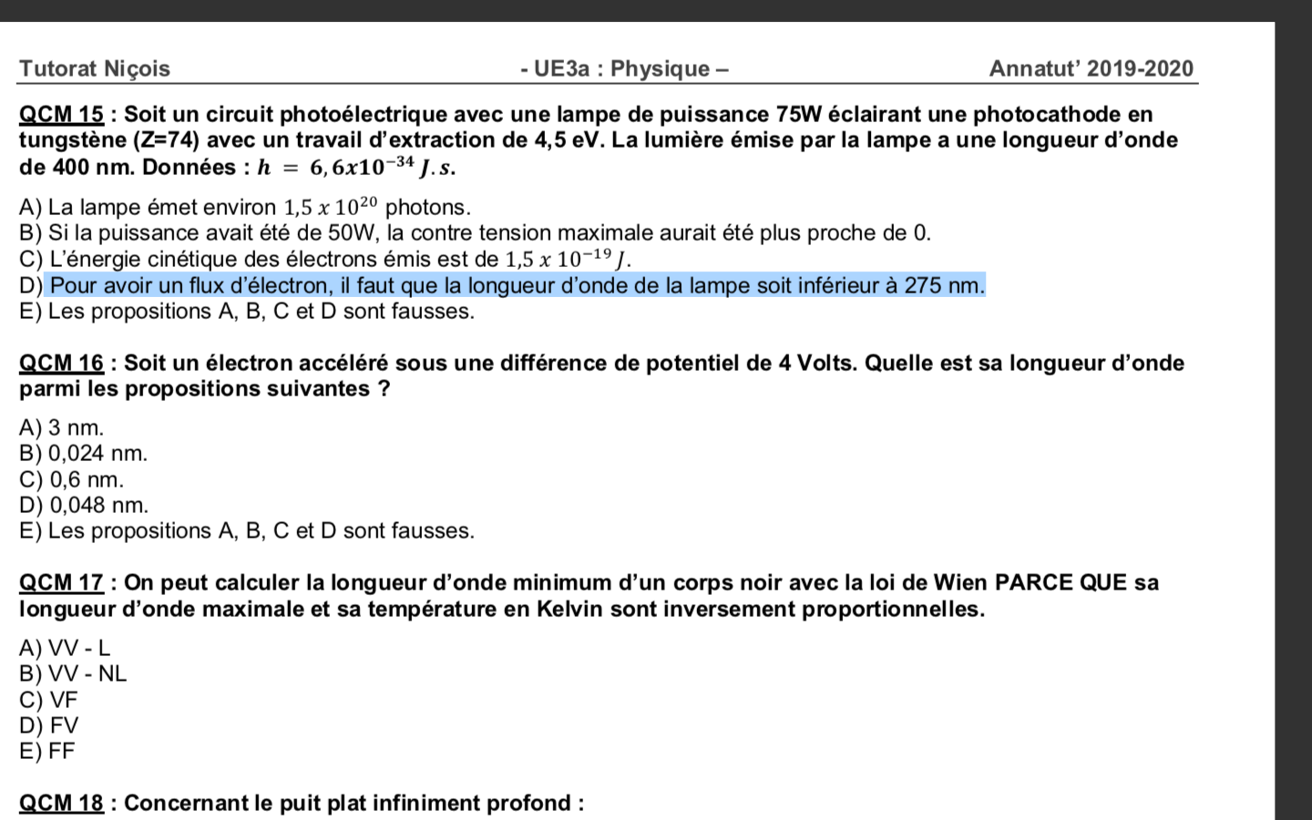 Salut, je ne comprends pas comment vous vous y êtes pris pour résoudre cet item (qcm 15, item D), pour quelle raison on divise hc par l'énergie d'extraction W ? Merci d'avance