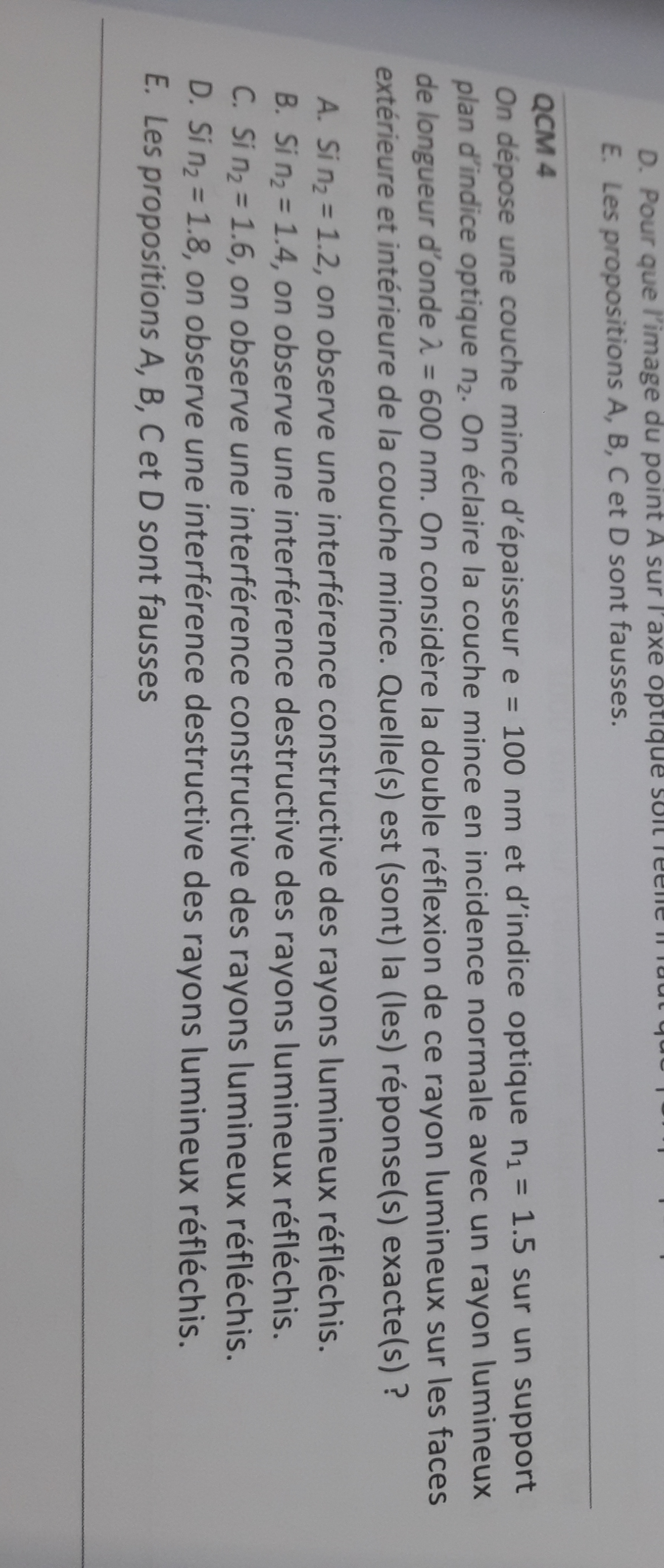 Je ne comprends pas trop comment procéder avec ce qcm, ni quelle formule utiliser et dans quel sens...Si j'ai bien compris dans ce genre de qcm on applique la formule avec l'indice optique de la couche, mais du coup je ne sais pas quoi faire des indices qu'ils proposent mdr. Aussi je comprends quelle formule utiliser quand les 2 indices sont identiques, et quand n2 est supérieur à n de la lame, mais quand celui de la lame est plus grand quelle est la formule ??