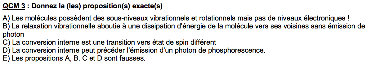 A propos de l'item D de ce QCM, je l'ai compté juste parce que lors d'une conversion interne, l'e- dans la molécule vibre beaucoup ce qui fait qu'il va retourner à son état fondamental, ce qui correspond à une conversion d'énergie de la molécule par un retour interne. Moi je comprend ça comme des réarrangement du cortex électronique donc avec la possibilité d'émission d'un photon... Est ce que mon raisonnement est correct?