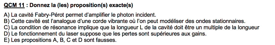 A propos de l'item C je ne comprend pas pourquoi il est compté faux car, être un multiple de la longueur d'onde et être un multiple de la demi longueur d'onde c'est la même chose... Parce que si on dit que x est un multiple de y ça veut dire que x=ky où k est n'importe quel réel, dont les décimales ... Donc k peut être égal à 0,5 ou à 0,5*n et donc l'item serait vrai car L=0,5*n*lambda. Si vous avez une explication je suis preneuse car il y a souvent des items comme ça...