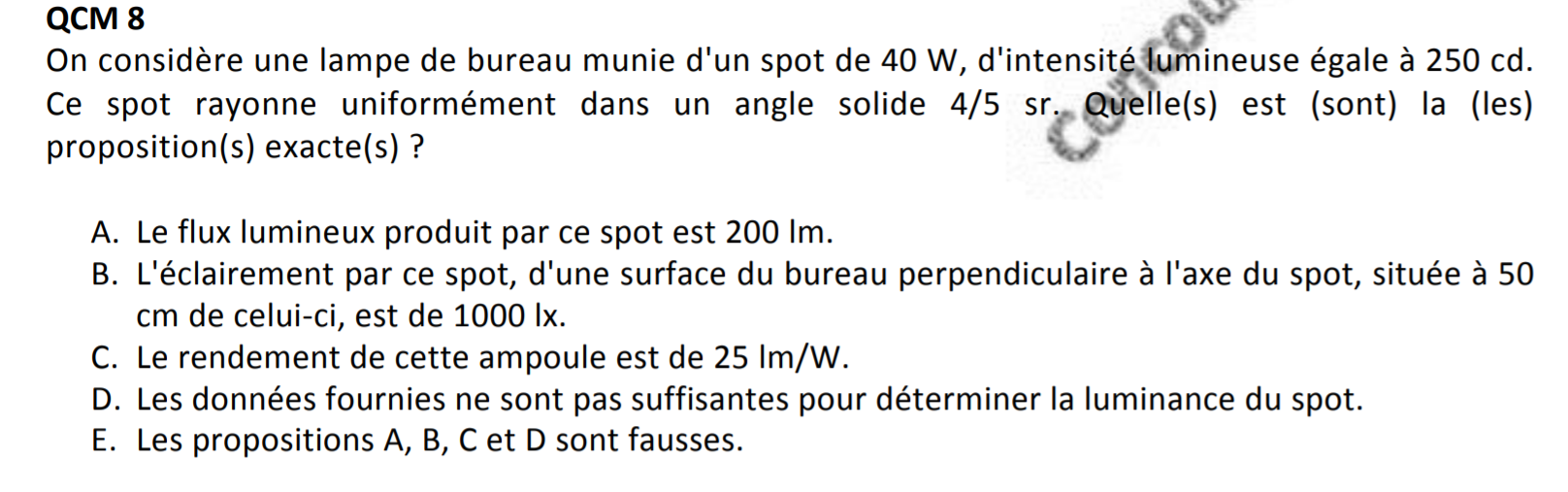 Par rapport à cet item, j'ai cherché dans la correction officieuse pour avoir une réponse mais les avis sont différents, certains disent qu'il est juste, d'autre qu'il est faux car on est dans le cas d'une source ponctuelle donc on ne peut pas ds tous les cas parler de luminance et c'est ce que j'ai pensé en le faisant... Est-ce que par hasard vous auriez une réponse ? (car dans la correction officieuse il a d'abord été compté faux puis juste)