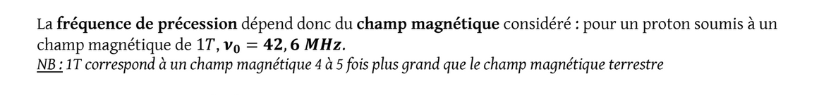J'ai un peu de mal à savoir quelle formule utiliser pour l'item c :la fréquence de Larmor du proton pour un champ de 10 tesla est inférieure à 100 MHz ; la correction dit seulement qu'elle vaut 426 MHZ environ... Merci!