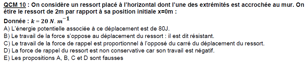 Concernant ce QCM 10, je ne comprends pas pourquoi dans le calcul de la force de rappel du ressort on considère ( X initial - X ), la formule comme je l'ai apprise considère (X -X initial) ce qui donnerait (2-0)² donc un travail proportionnel à la force de déplacement du ressort et non pas son opposé... Ou bien y a t-il une histoire d'orientation de l'axe?
