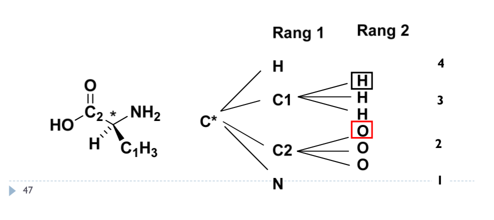 Comme tu peux le voir, au rang 1 on a l'azote N. Mais après, on a ambiguïté entre deux carbones (C1 et C2) et c'est que C2 possède une double liaison avec l'oxygène (la fameuse liaison multiple dont parle la ronéo) et ce n'est pas le carbone asymétrique C* hein c'est bien C2 !