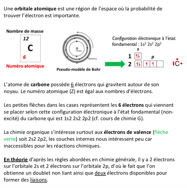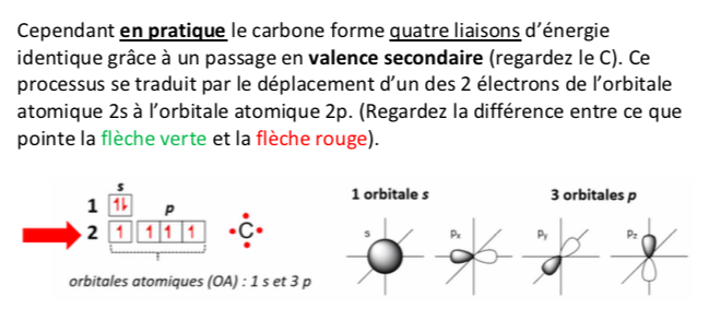 Coucou alors clairement pour le remplissage des cases quantiques par les électrons du carbone je pourrais pas t'expliquer mieux que ce que j'ai fais dans ma fiche, du coup je te mets le screen ici :