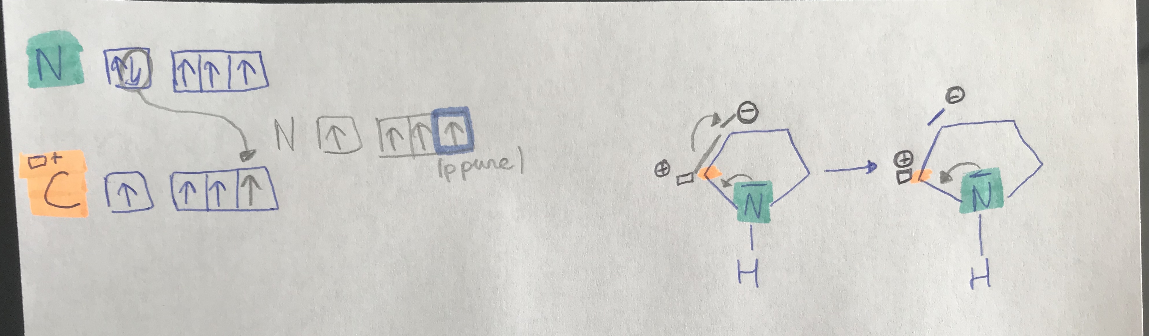 À droite j'ai fait le schéma du déroulement de la mésomérie du coup la double liaison par sur le C avec l'apparition d'un DNL et charge négative ce qui entraine une case vacante sur le carbone qui va recevoir un électron de notre DNL de l'azote par le phénomène de liaison par coordinence et après avoir cédé l'électron la je suis d'accord pour parle d'hybridation sp3 avec un p pure