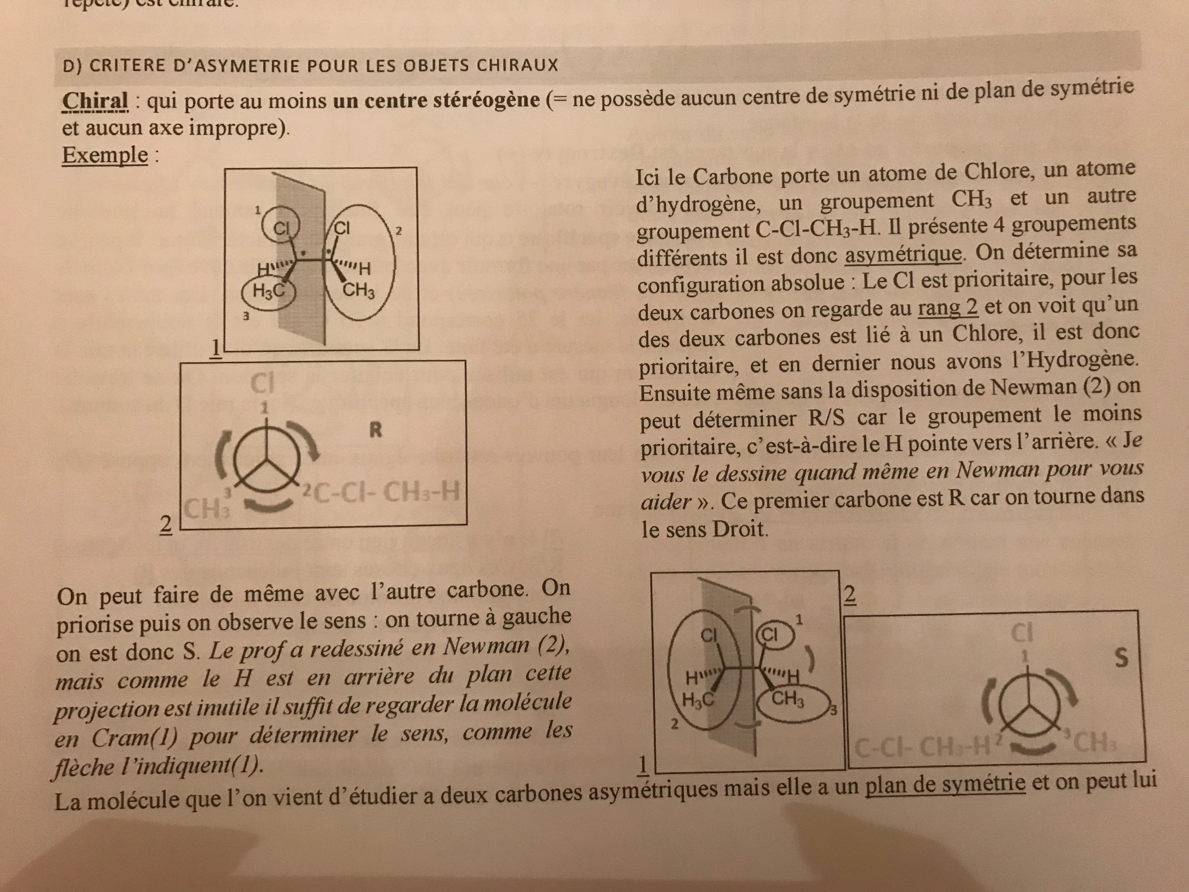 Je n’arrive par sur cette partie du cours sur la chiralité qui m’embête un peu. En effet, sur cette molécule est déterminée la configuration absolue R/S ( qui sert a caractérisé les molécules asymétrique). Or cette molécule est achiral car possède un plan de symétrie. Je suis un peu perdu dans la relation entre chiralité et configuration absolue. Je pensais que la configuration absolue ne s’appliquait que sur des molécules chirales.