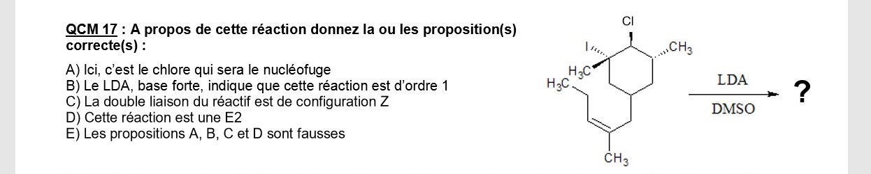 Quelle est cette réaction ? On a une base forte avec un solvant aprotique, on s’engage donc plus vers une E2 et tout ce qu’elle implique (arrachement en anti, Zaitsev quand c’est possible etc). Maintenant, quel est le nucléofuge ? On serait tenté de dire le