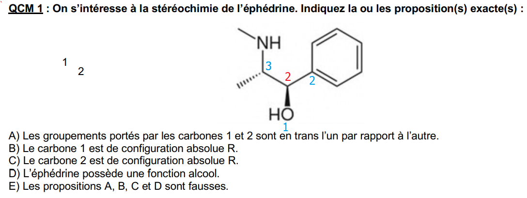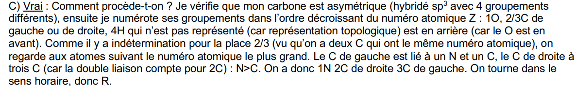 J'ai numéroté le carbone à gauche en 3 car lié à un N et un C (6+7=13) et celui de gauche en 2 car lié à 3 C (6*3=18>13) et donc je tourne en S sans changer de sens car le H est en arrière.