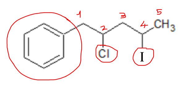 On a bien un groupement benzène sur le carbone 1, un chlore sur le carbone 2 et un iode sur le carbone 4, la chaîne carboné principale est composé de 5 carbones donc c'est du pentane :arrow: 2-chloro-4-iodo-1-phénylpentane